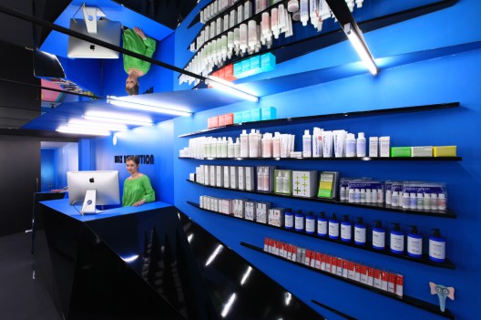 A series of shelves are used to display the various products sold at Wax Revolution which include brands such as Mallin + Goetz, Baxter of California, Snowberry, Uslu Airlines and Rubis Switzerland which become a visual focus point when waiting for an appointment.